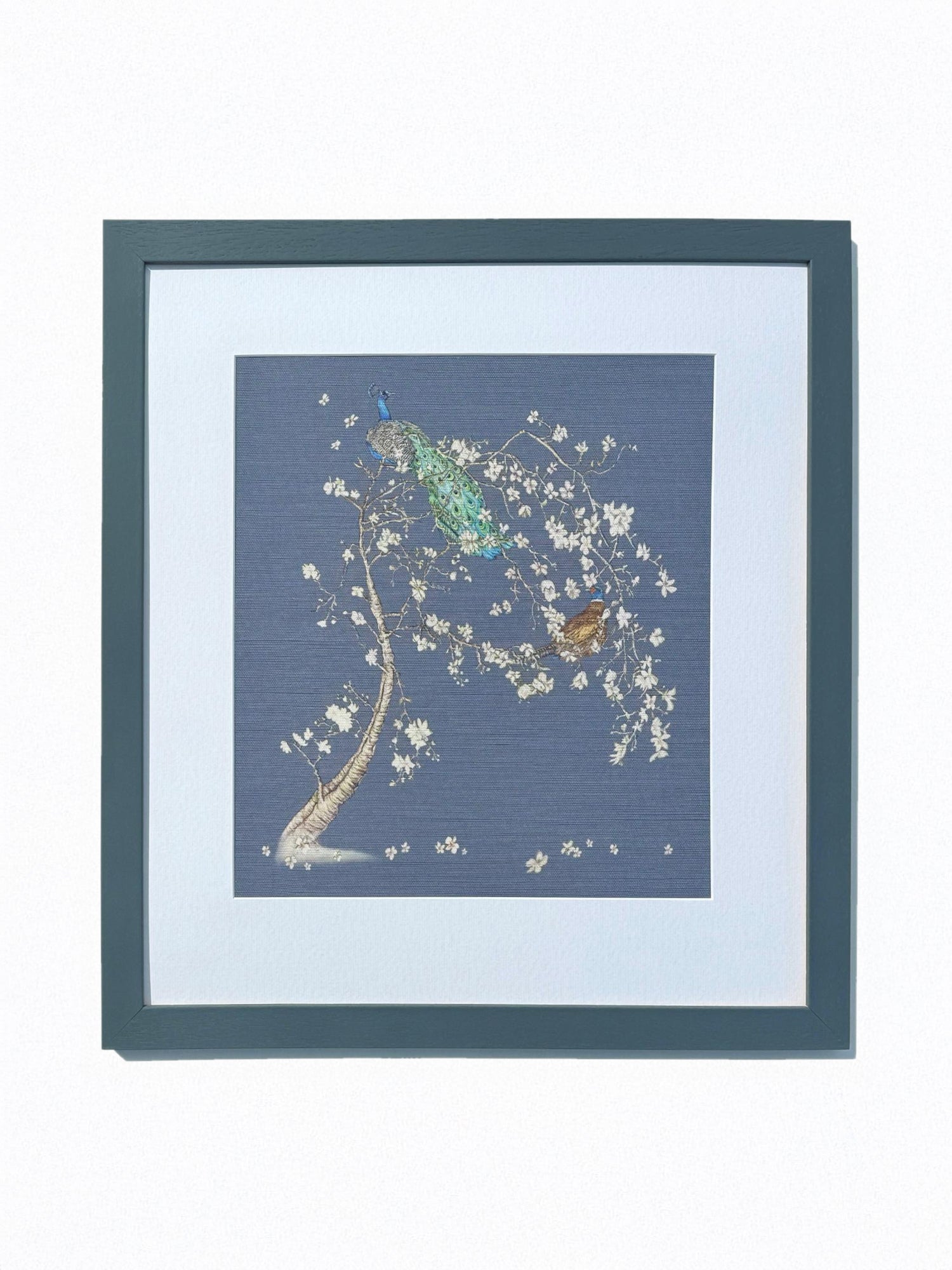 The Indian cherry tree, which grows in the Himalayas is one of a kind, only blooming in the Autumn. Sitting in the branches is the pheasant, a symbol of imagination and creativity. Accompanying him is the peacock, a sacred bird in Hinduism, considered to be a symbol of the divine and good.